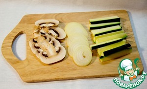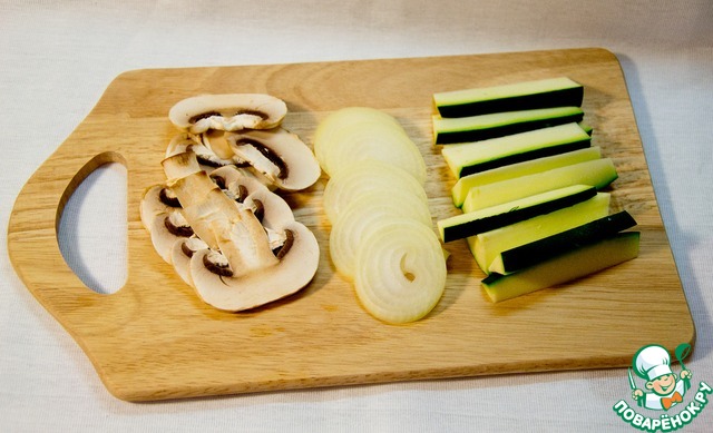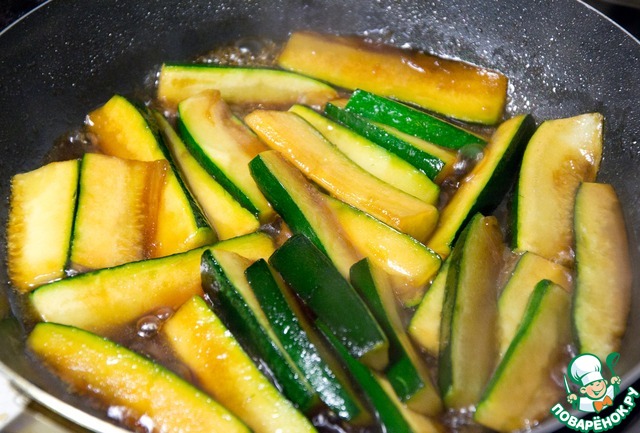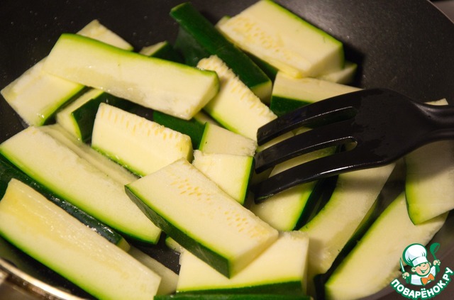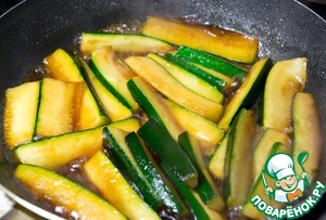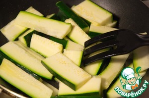 На разогретую сковороду с небольшим количеством растительного масла выкладываем цукини и слегка обжариваем.