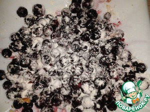 Тем временем, в заранее размороженную смородину добавить 70 г муки, мелко молотый миндаль, имбирь, корицу, черный перец, все перемешать.