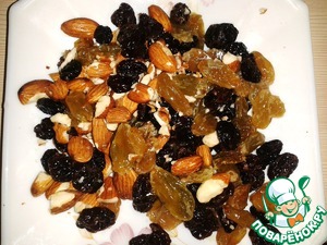 Сухофрукты и немного измельченный миндаль смешать вместе. Изюм тоже лучше заранее промыть горячей водой