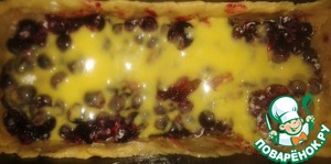 Тесто разделить на две части, раскатать, выложить в форму и добавить наши ягоды и орехи. Залить кефирной смесью.