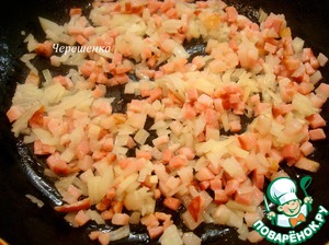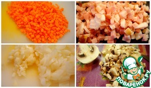 Для начинки - грудинку, лук, морковь и шампиньоны нарезать мелкими кубиками. Чеснок измельчить.