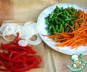 В нашем случаем мы ничего ни тушим ни варим. Итак, предварительно вымытую фасоль (замороженную тоже промываем) заливаем кипятком. Залили и пусть себе стоит минут 15-ть. В это время трем-нарезаем лук, морковь, перец. -
