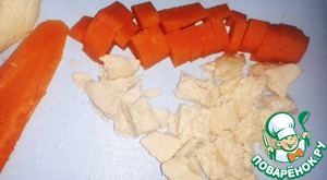 В середину формы выложить кусочки перца и зелени, следом ранее подготовленные ингредиенты. Желатин развести, добавить в бульон, в котором варилась грудка и морковь, и залить формы. Поставить в холодильник до полного застывания желатина.