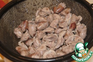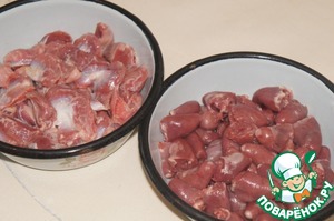 Потроха нарезать кусочками, накрыть пленкой и отставить.