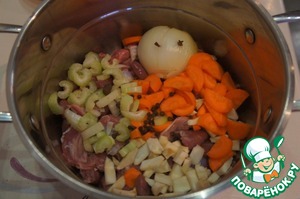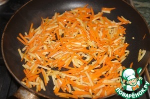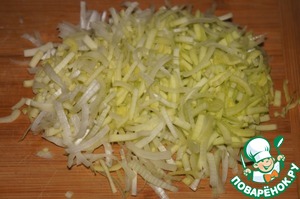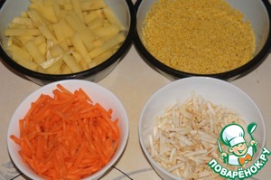 Пшено хорошо промыть. Морковь и сельдерей нарезать соломкой, картофель - брусочками.