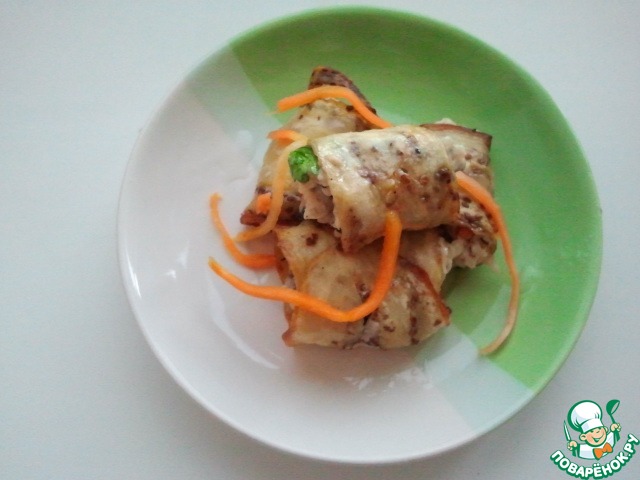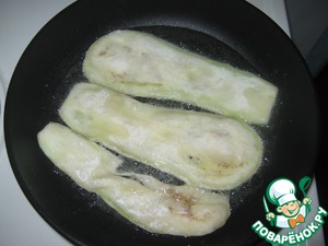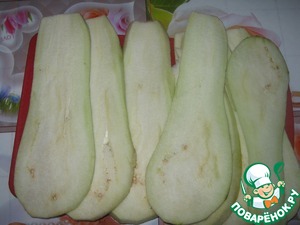 С баклажана очистить кожу, нарезать вдоль пластами по 4 мм, посолить, оставить на 30 мин.