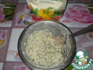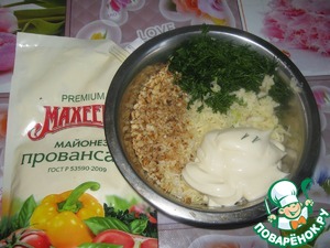 Приготовим начинку. Натираем сыр на мелкой терке, режем укроп, грецкие орехи, предварительно обжаренные, измельчаем, добавляем майонез, чеснок.