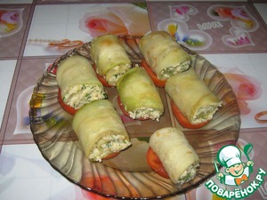 Сворачиваем баклажаны рулетиками, кладем их на колечки помидор.
