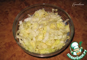 Листья салата «Айсберг» промыть, обсушить, мелко нарезать или порвать руками.