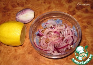 Репчатый лук нарезать тонкими полукольцами и замариновать в лимонном соке и 1 ст. л. оливкового масла.