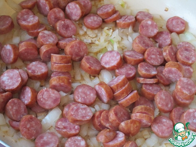 • Обжарить на растительном масле, добавить охотничьи колбаски, нарезанные кружочками.