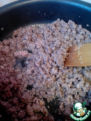 Теперь можем приступать к подготовке фарша. В сковороду наливаем растительное масло и добавляем фарш. Как только фарш потеряет розовый цвет, добавляем вино, увеличиваем огонь до максимальной позиции и ждем, пока жидкость не выпарится.