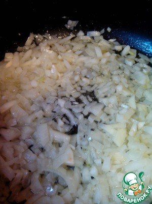 Теперь делаем мою любимую овощную обжарку) Наливаем в сковороду оливковое масло и кладем туда же кусочек сливочного (30г). Когда сливочное масло растопится, добавляем в сковороду лук с чесноком и обжариваем на тихом огне до прозрачности.