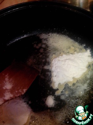 Добавляем муку и обжариваем на тихом огне до "орехового запаха". Как только вы его почувствуете, постепенно добавляйте молоко. Конечно же предварительно вынув из него лавровый лист.