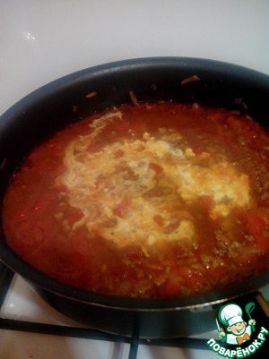 Предварительно нужно вскипятить 300 мл воды и залить кубик говяжьего бульона. Как только вино выпарилось, добавляем бульон, томатную пасту и овощную обжарку. Теперь можно посолить, поперчить и добавить любимые вами специи. Перемешиваем, доводим до кипения и оставляем готовиться на 50 минут (Временами помешивая).