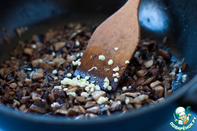 На сковороде разогреть растительное масло и обжарить лук с грибами 15 минут. Снять с огня, посолить, поперчить и добавить измельченный зубок чеснока.