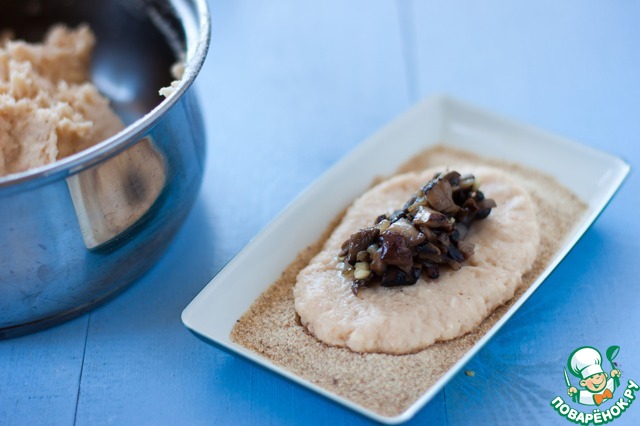 Насыпьте на тарелку панировочные сухари, влажными руками сформируйте лепешку и положите в центр грибную начинку.