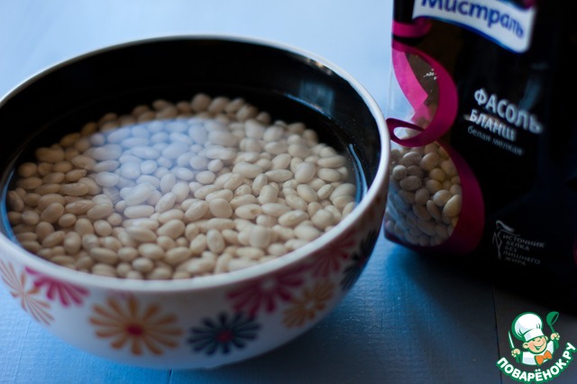 Белую фасоль замочить на 5 часов, а лучше на ночь. Утром воду слить, залить чистую и отварить до готовности.