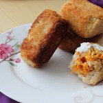 При помощи двух широких ножей придайте крокетам прямоугольную форму. Обжарить крокеты на растительном масле до золотистости.