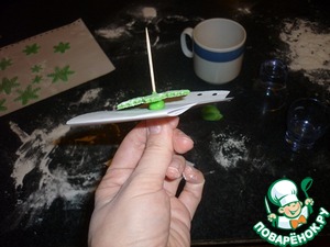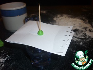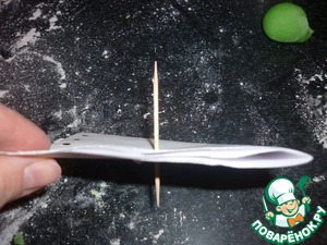 Отщипните небольшой кусочек мастики, скатайте из него шарик и наденьте на зубочистку вплотную к бумаге.