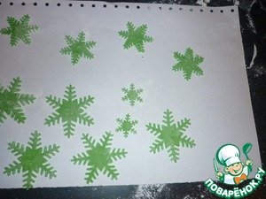 Вырежьте вырубкой для снежинок заготовки. На одну елку нужно три больших, две средних и одну маленькую снежинку.