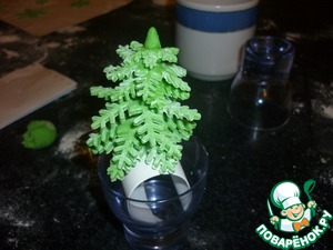 Слепить треугольничек из мастики и прилепить на макушку елки (замаскировав конец зубочистки).