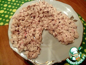 Вареную куриную грудку мелко порезать и выложить на блюдо в форме лошади, посолить, поперчить, смазать майонезом «Махеевъ»