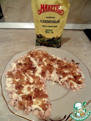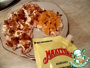 Почистить и мелко порезать мандарин, выложить на лук, смазать майонезом «Махеевъ».
