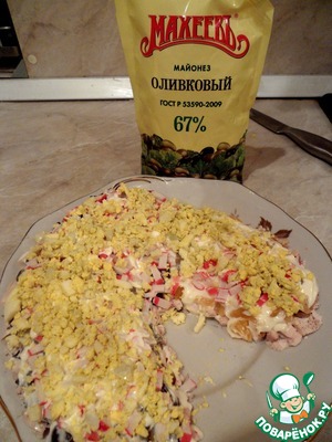 Сверху выложить мелко порезанные крабовые палочки и яйцо, смазать майонезом.