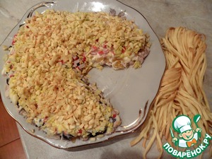 На мелкой терке натереть вареную морковь и выложить поверх салата.