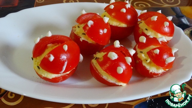 Наполняем наши помидоры рaзными начинками. Глазки делаем из гвоздики. Крылышки из половинок помидор кладём сверху. И рисуем майонезом точки. Готовые "Божьи коровки" выкладываем на блюдо с зеленью.