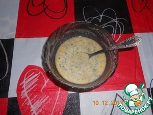 • Муку развести водой до консистенции жидкой сметаны. Добавить соль, перец, кумин, чеснок, соду, растопленный маргарин, нарубленную мяту. Хорошо перемешать.