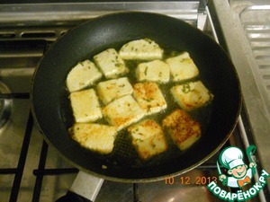 • Разогреть в сковороде растительное масло. Каждый ломтик сыра окунуть в кляр и обжарить с двух сторон до золотистой корочки 3-4 минуты.