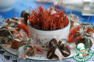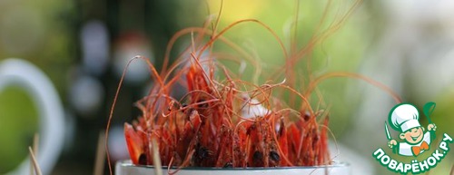 Даем им чуть-чуть остыть. И дальше полет вашей фантазии. Головы очень красиво сложить в середине, так, чтоб их красивые усы торчали вверх, у меня они в соуснике, но я видела вариант деревянных коробочек из спичек и шпажек.