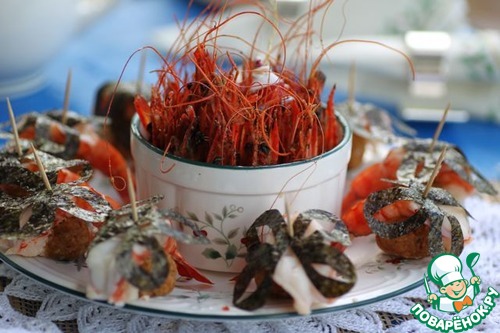 Окончательной идеей было украсить креветки бабочками, их я вырезала из нори. Но так как влажность у меня ужасная, нори быстро впитала влажность и опала.