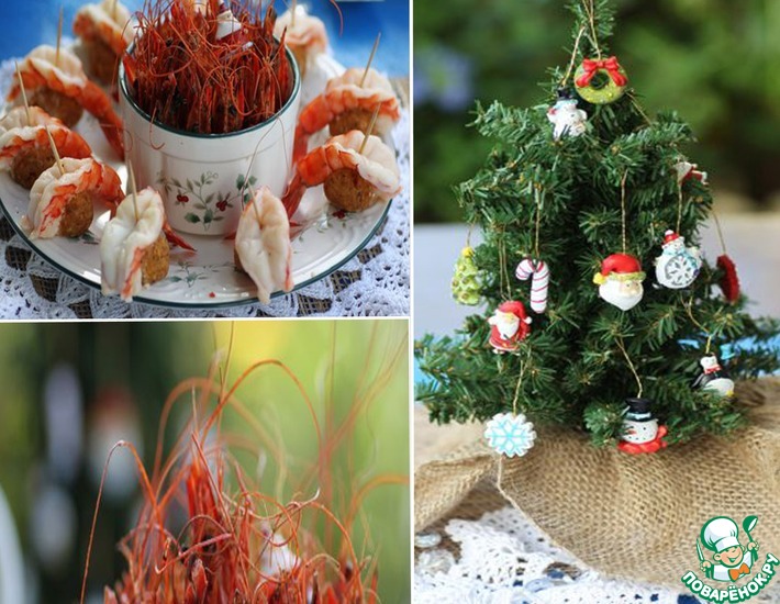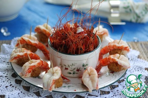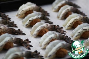 Из фарша формируем шарики размером с вареный желток. Кладем под хвост креветки, расправляем хвост веером. Закрепляем зубочисткой.