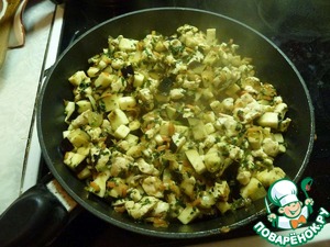 К овощам на сковородку добавляем то, ради чего мы здесь собрались: курицу и баклажаны.