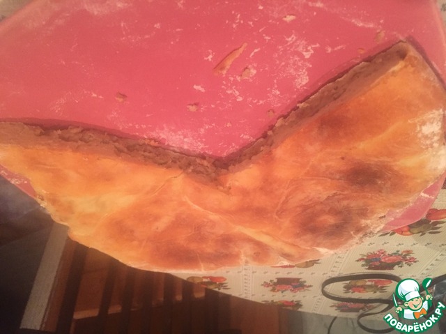 Нужно перевернуть пирог и осторожно руками разравнивать начинку, начиная с краёв, не очень сильно растягивая, поскольку ещё на сковороде нужно его растягивать.
