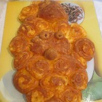 Из двух кусочков теста формируются "лицо" и "шапка", остальное тесто раскатываем, смазываем маслом, посыпаем сахаром, скручиваем в тонкий рулет, нарезаем кружочками и выкладываем бороду и волосы.