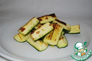 Режем цуккини, сбрызгиваем оливковым маслом и ставим в духовку на гриль - минут 10, все зависит от вашей духовки.