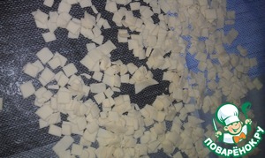 Тесто раскатать тонко (0,5 мм) и нарезать на кубики.
