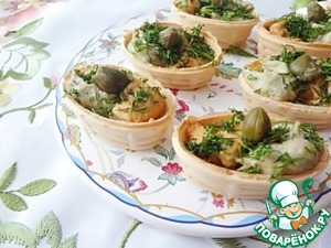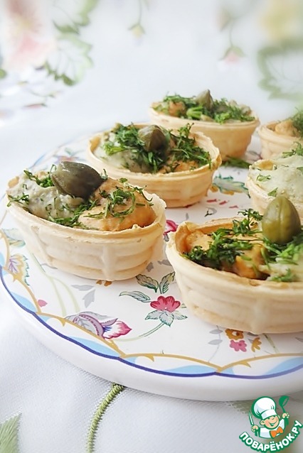 Пользуясь кондитерским шприцем или любым другим подходящим приспособлением, наполнить лукошки с двух сторон кремом разного цвета. Сверху посыпать измельчённой зеленью (она служит не только для красоты, но и предохраняет закуску от обветривания) и положить по каперсу. Каперсы придают свою изюминку лукошкам.