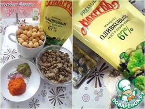 Нут замочить в холодной воде на ночь. Утром отварить. Чечевицу варить без замачивания. Можно использовать один вид бобовых. Хотя я никогда для этой закуски не варю бобовые специально. Готовя с ними блюдо, варю их с запасом. При приготовлении крема для лукошек я использовала Майонез оливковый 67% ТМ Махеевъ. -