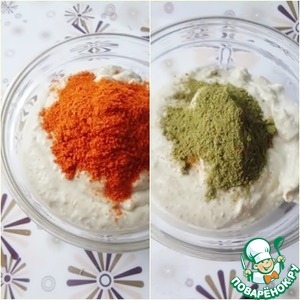 Разделить крем на две части. Одну смешать с паприкой, другую с хмели-сунели. Можно подсолить. Получаем крем с оттенком розового цвета и зелёного.