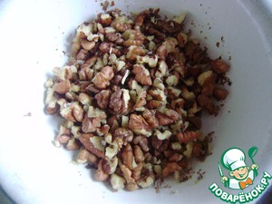 Орехи слегка измельчаем, чтобы остались крупные кусочки. Обычно я делаю это руками или в ступке. Добавляем их в тесто.