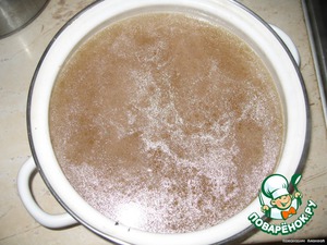 Отдельно варим шеи, в холодную воду добавляем стебли ревеня и луковицу с кожурой, после закипания удаляем пену, убавляем огонь и варим 20 минут. Добавляем половину специй, соль и варим еще 10 минут.