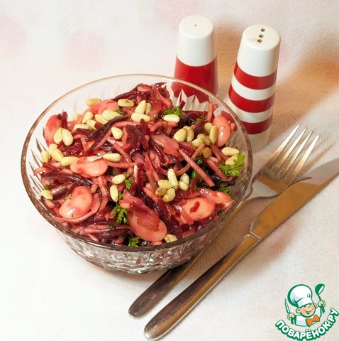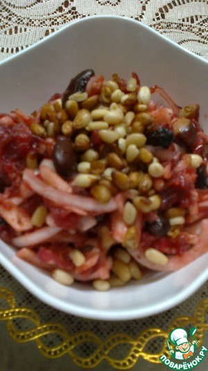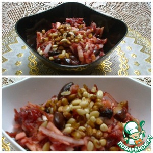 Теперь заправка: разбавим с водой уксус 70% так, чтоб вам водичка понравилась на вкус; нам понадобится 2-3 столовых ложки. Польём наш салатик+ масло растительное 2-3 ст. ложки. Добавляем соль и перец по вкусу!