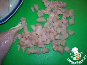 Курицу нарезаем кубиками, обжариваем в кастрюле на оливковом масле до золотистого цвета.