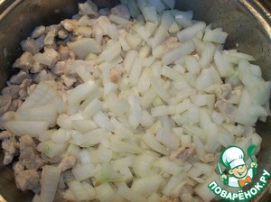 К подрумяненной курице добавляем лук и тушим все вместе минут 5.