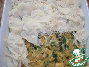 Форму для запекания хорошенько смазываем сливочным маслом и выкладываем смесь. Тесто фило разрываем на небольшие квадраты, сминаем их и выкладываем сверху.